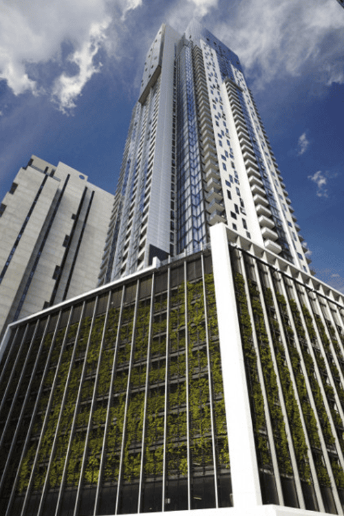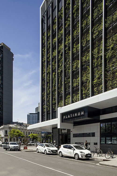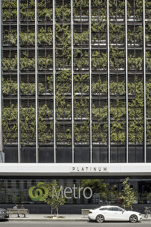 Large scale green facades are rarely easy and straight forward, it is almost like waiting for the planets to align. For Platinum Tower in Melbourne it took a concerted effort from Tensile, Fytogreen and landscape architects Aspect Studios to realise the 1700m2 green facade. Spanning between levels 2 to 10 the green facade is made up of 203 bays that wrap the podium north and east facades.